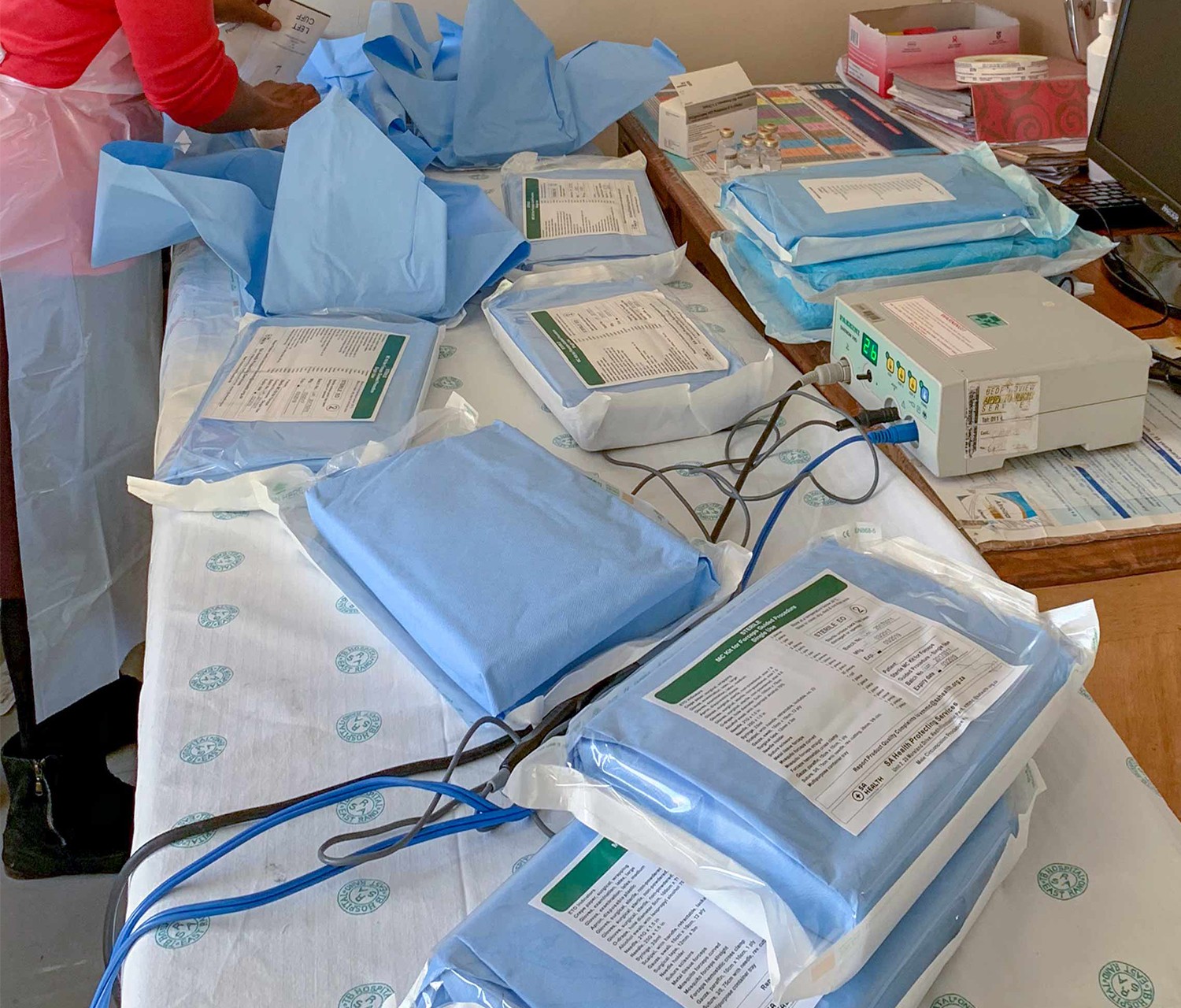 Nursing staff preparing for the day’s VMMC procedures. Sealed sterilized packs in the foreground will remain closed until needed.